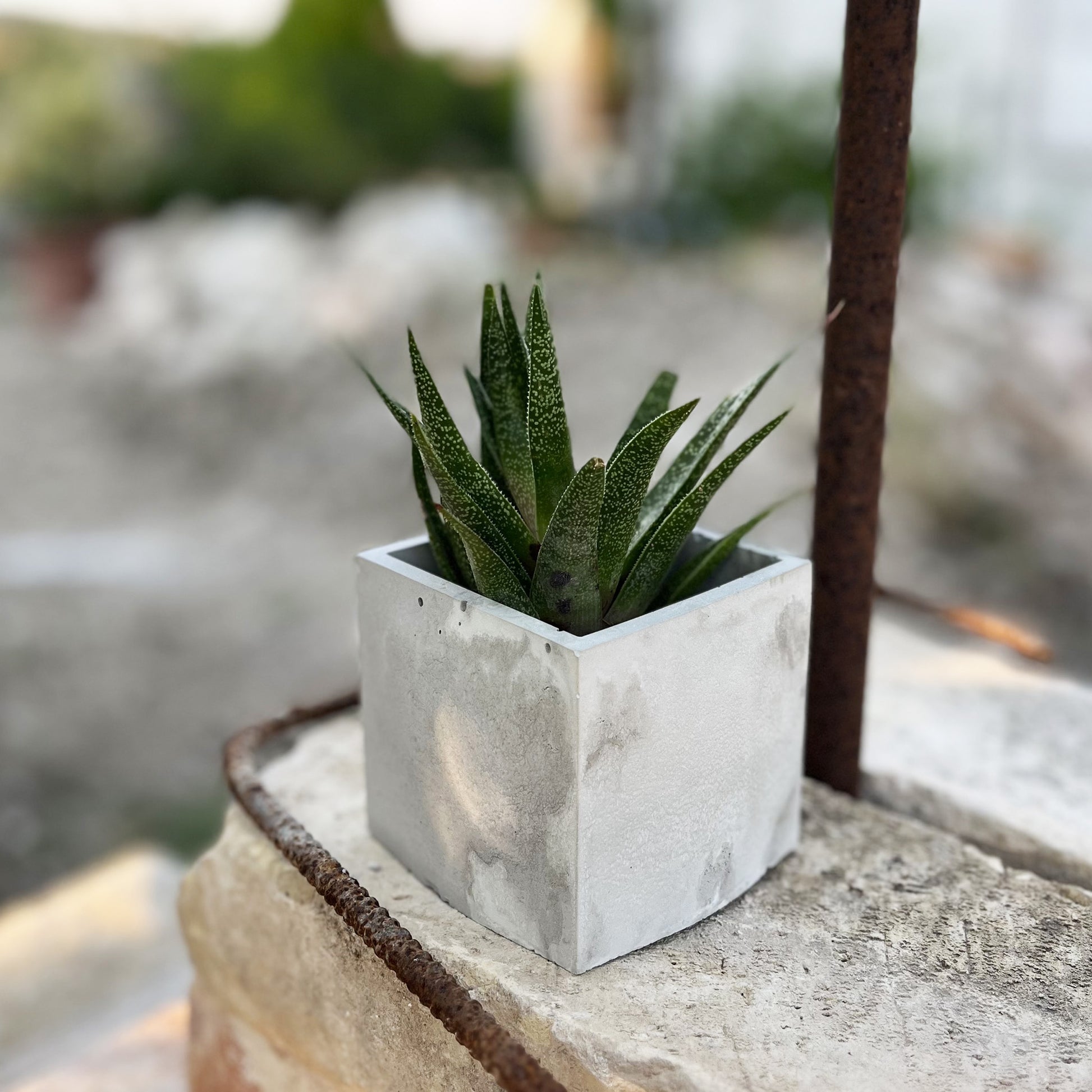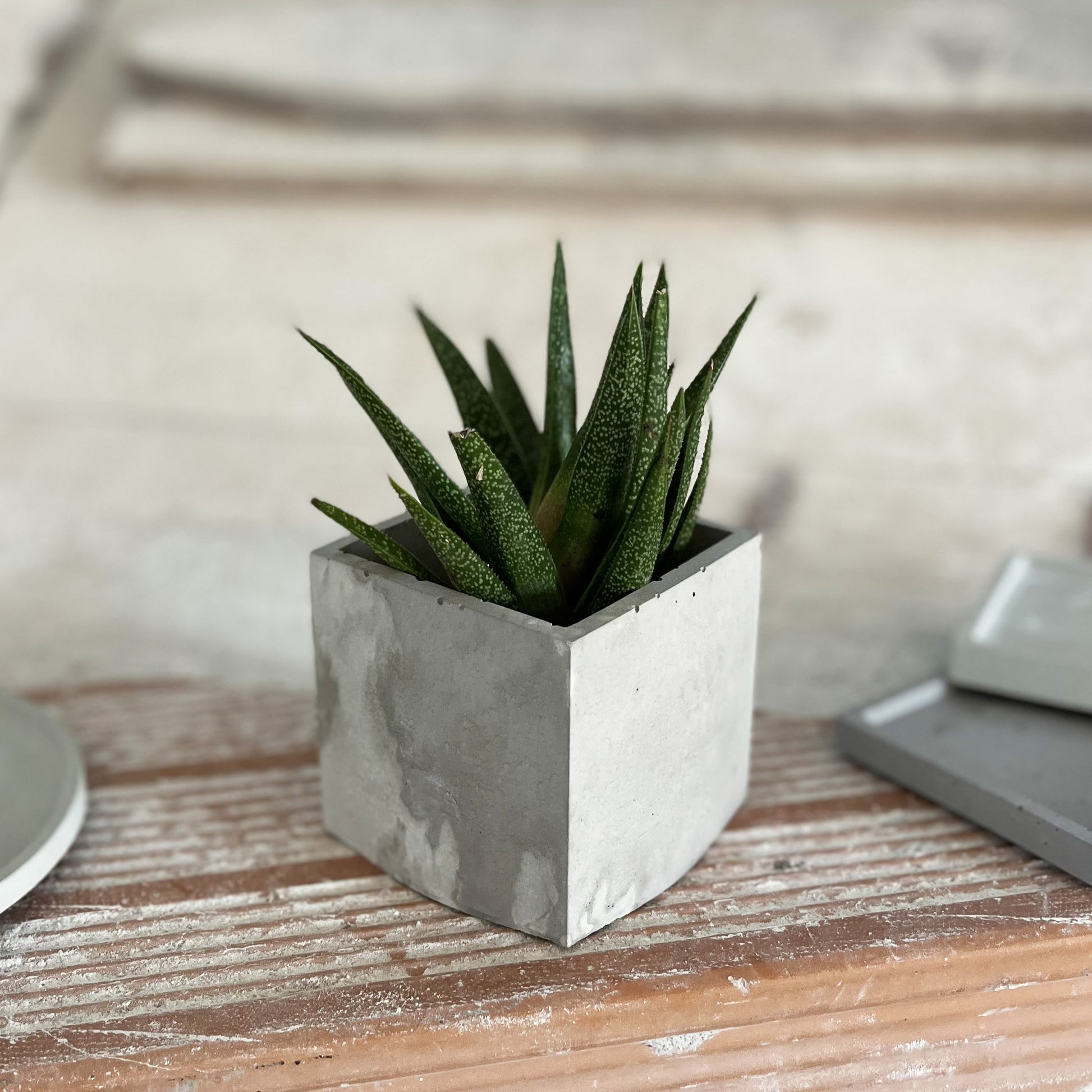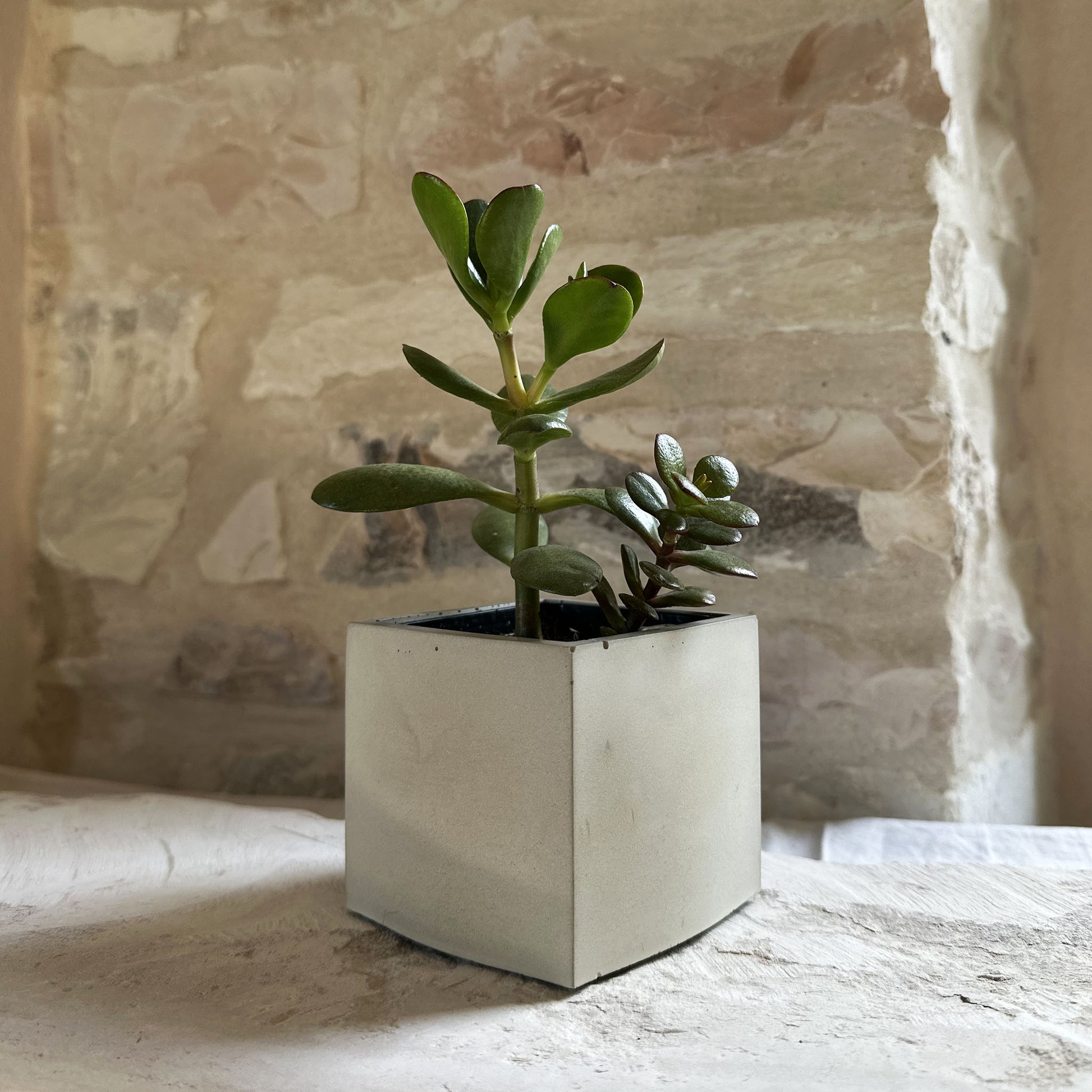 Un volume solido e immobile che accoglie la vitalità della pianta, creando un equilibrio silenzioso tra materia e crescita.